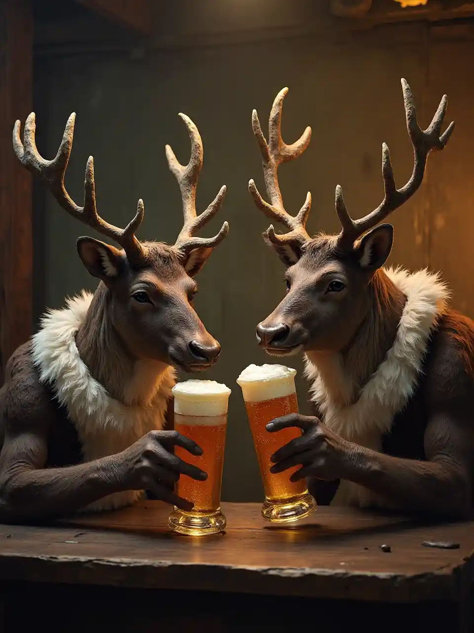 Dwóch reniferów pijących piwo w tawernie i wyglądających tajemniczo