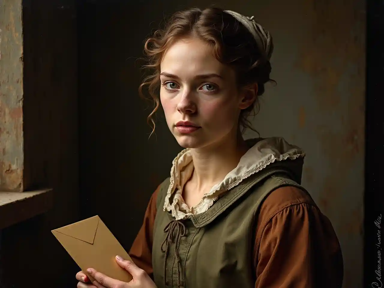 laaaaraSztuka Rembrandta o oszałamiającej, smutnej, młodej kobiecie z otwartymi ustami, trzymającą czerwoną kopertę, w czeluści i wiejskiej, średniowiecznej odzieży, zgaszonych ziemi kolorów,