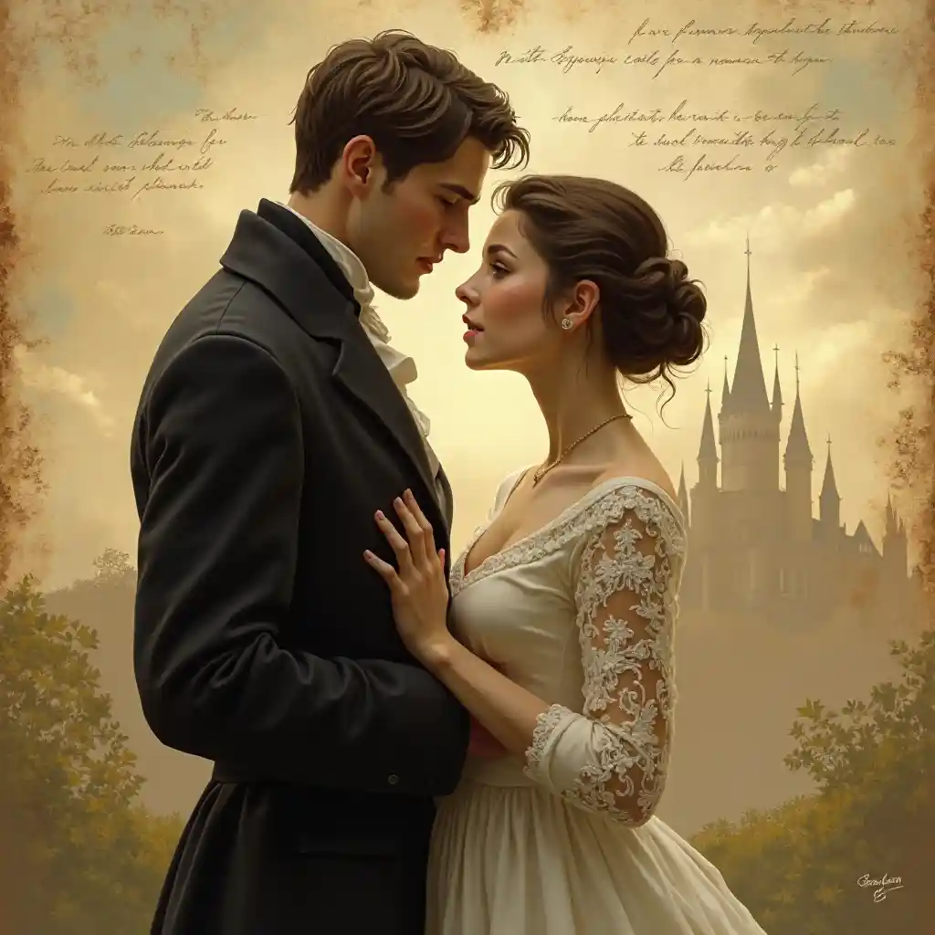 Cyfrowy obraz/ilustracja przedstawiająca mężczyznę w ciemnym płaszczu, kobietę w jasnej koronkie sukni, oba w profilu. Tło: starzejąca się pergamin z napisem, ziemne formacje chmur, odległy zamek. Ciepła, ciche kolory. Wzywa romantyzm: emocje, dramatyczne światło, idealizowane postacie, sugestie narracji.