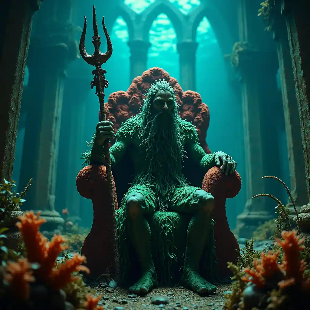 Bogiem morza z włosami i brodą z wodorostów pokrytych brązowymi wędrami siedzi na tronie z czerwonego koralu trzymając zardzewiały trójoszek również pokryty brązowymi wędrami w ruinie podwodnego gotyckiego budynku zburzonego sufitu i wysokich, łukowych, gotyckich okien. Mistyczna podwodna atmosfera. - Wędkarstwo. Ciemno-cyjowa mgła . Słabie światło z niebiesko-zielonymi promieniami, które filtrują przez wysokie, gotyckie okna.