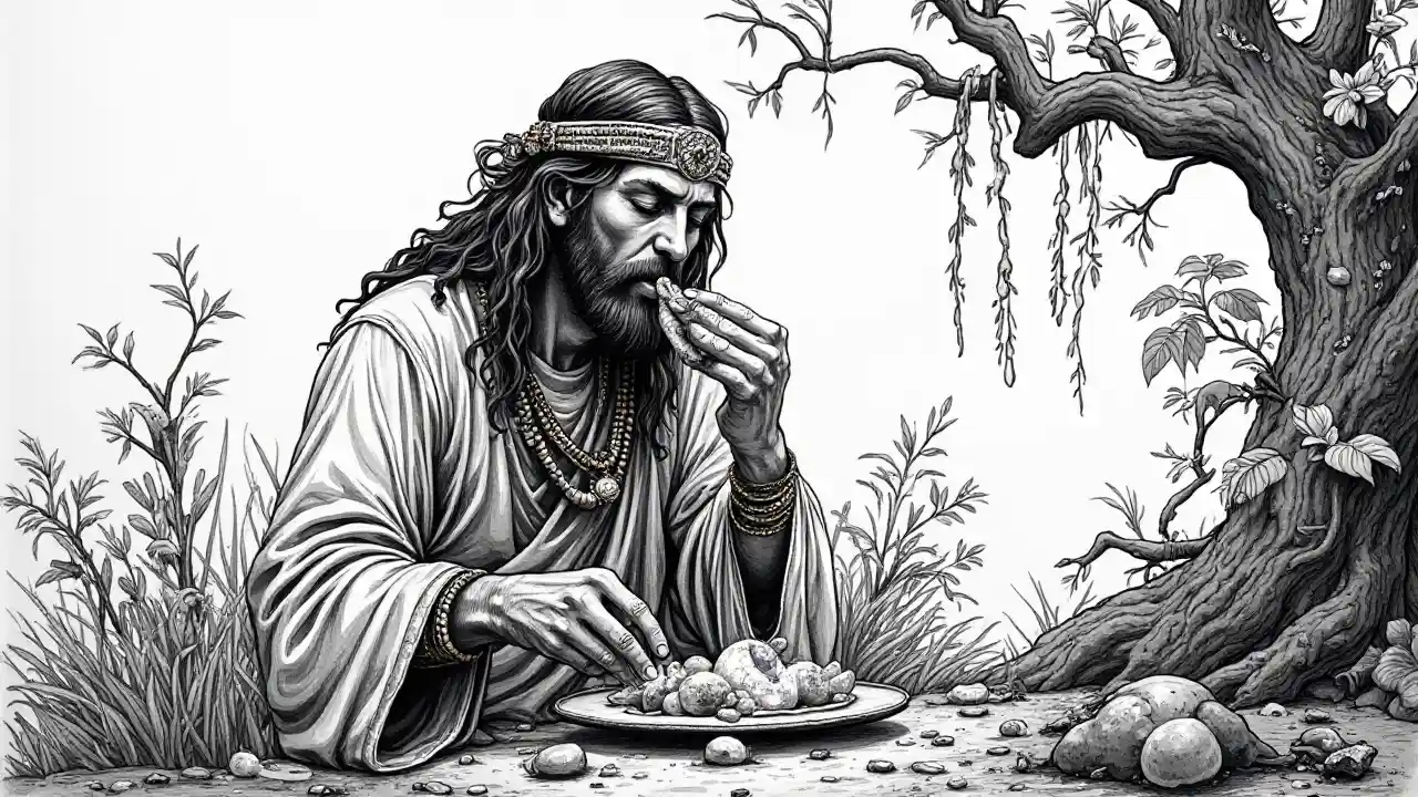 Jezus, realistyczny Szaman spożywający ayahuaskę, ilustracja atramentem, czarno-białe, drobne linie, skomplikowane szczegóły, bardzo szczegółowe