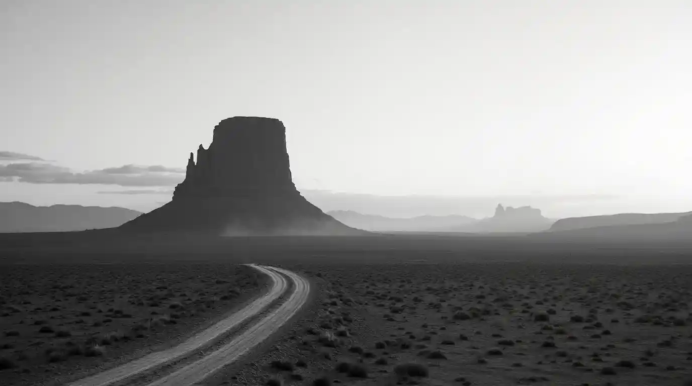 Fotografia monochromatyczna przedstawiająca kultową sylwetkę Shiprocka, uderzającej formacji skalnej wystającej w górę w środku ziemi, w opuszczonym pustyniu. Wąska ścieżka gruntowa węża od dolnego punktu do podstawy formacji. Niebo jest jasnym szarości, z rzadkimi, miękkimi chmurami widocznymi w odległego lewego tle. Ziemia jest płaska i jałowa, podkreślona przez cienkie oświetlenie i tekstury. Długa, pozioma mgła rozciąga się po środku, nadając jej eteryczny charakter. Fotorealistyczna tekstura, czarno-biały, wysoki kontrast, głębokie cienie, minimalistyczna kompozycja, atmosferyczny, bezczasowy, ostry, kontemplacyjny ton. Scena jest pozbawiona życia, podkreślając izolację i spokój.