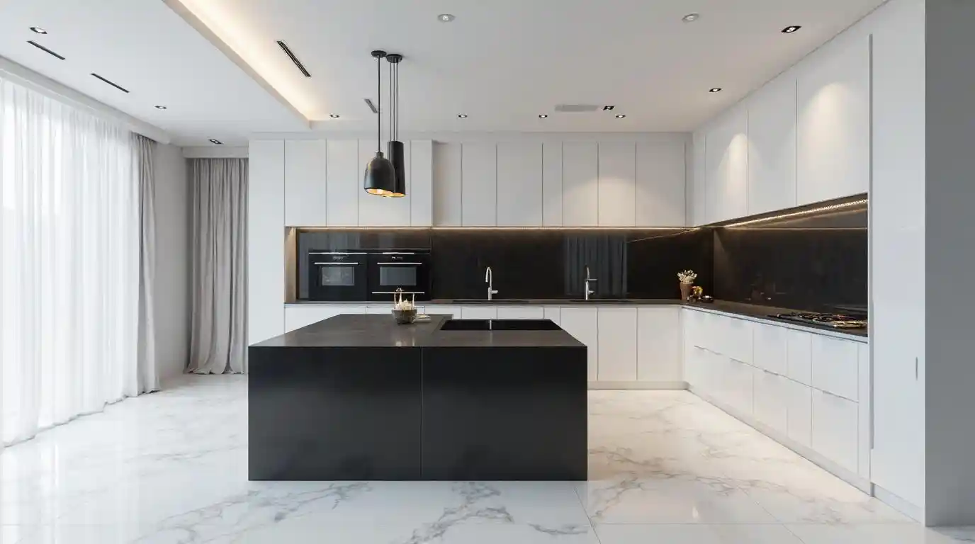 Futurystyczna kuchnia z gładkimi białymi blachami, szafami bez uchwytów i zintegrowaną technologią. Ciemne, niebieskie wyspki licznik w środku, eleganckie chromowane urządzenia, i ukryte oświetlenia pod szafami. Minimalistyczne oświetlenie wiszące na górze. Przestrzeń jest czysta i otwarta, podkreślając pustkę i równowagę. Naddetalne tekstury na marmurze i stali.