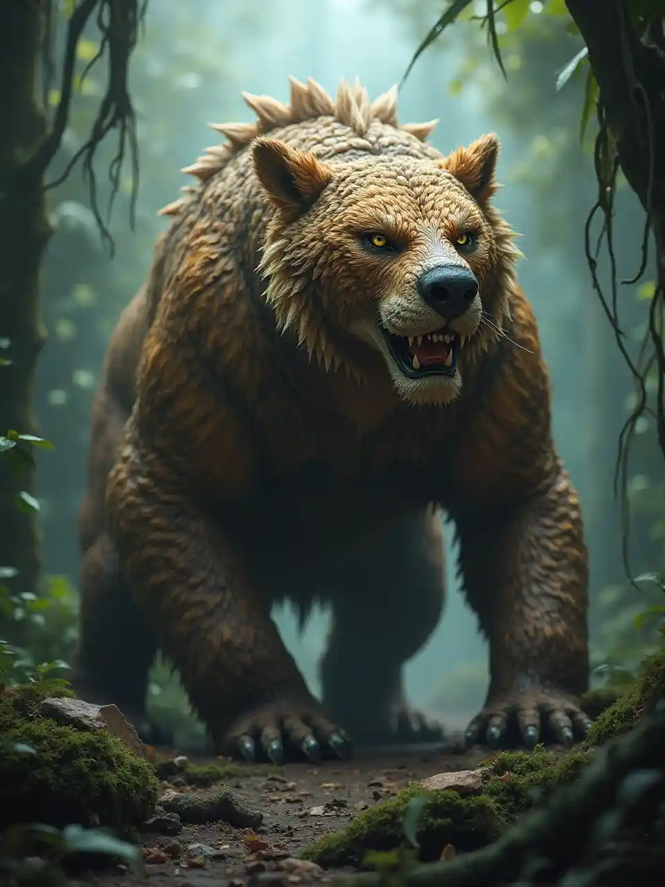 Fantastyczna istota z wężowym ciałem pokrytym grubym, niedźwiedziczym futrem, nadając jej szorstki, dziki wygląd. Ma cztery silne, tygryskie nogi z ostrymi pazurami, które dodają do jego drapieżnego charakteru. Jego twarz łączy węże i ssaki, ma ostre, podcięte oczy, łuski pomieszane z plasterami, a jego wyraz jest przerażający. W tle gęsta, mglista dżungla, dodająca tajemniczej atmosfery. Wydaje się, że zwierzę to wtopiło się w otoczenie, łącząc w sobie zwinność węża, siłę niedźwiedzia i niewidoczność tygry".