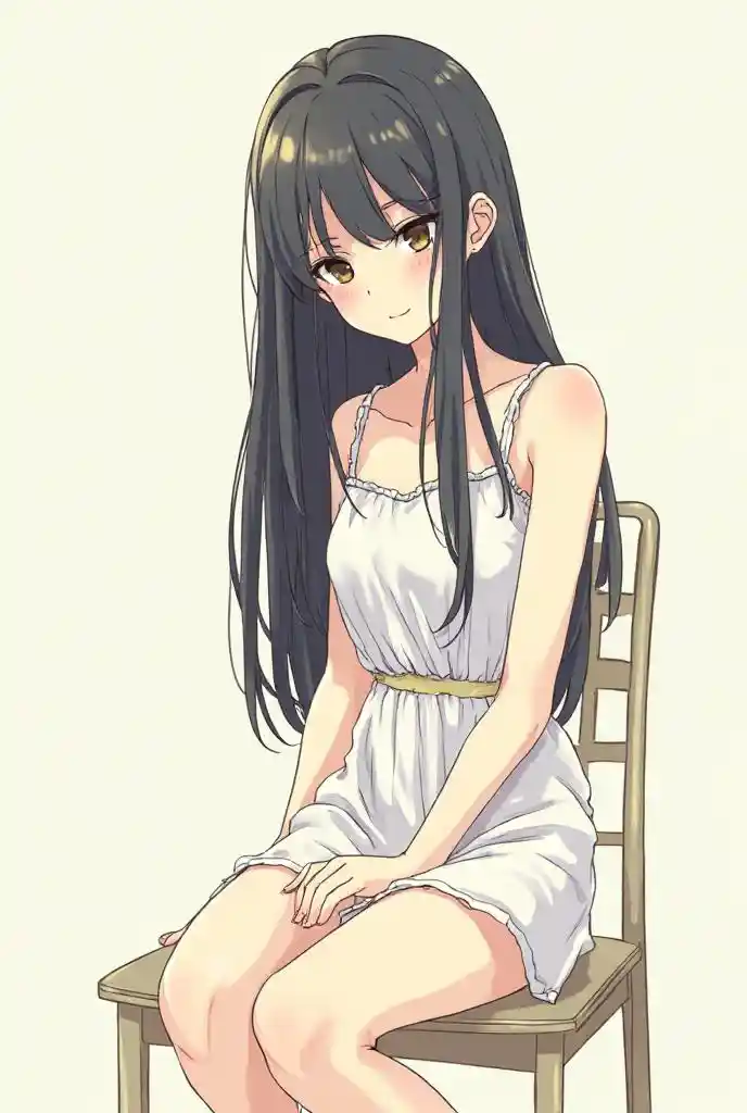 Gareth"Sztuka mistrzowska, najlepsza jakość, 1 dziewczyna, solo, płaskie Ilustracja, rysunek linii, długie włosy, czarne włosy, proste włosy, letnia sukienka, siedząc na krze, patrząc w dół, sim"