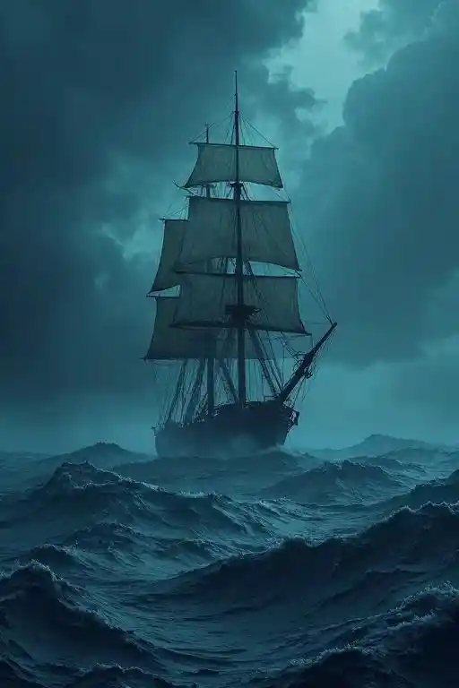 Statek z epoki wiktoriańskiej w burzliwym morzu, szalejąca burza i ten statek można zobaczyć w środku, ciemna noc