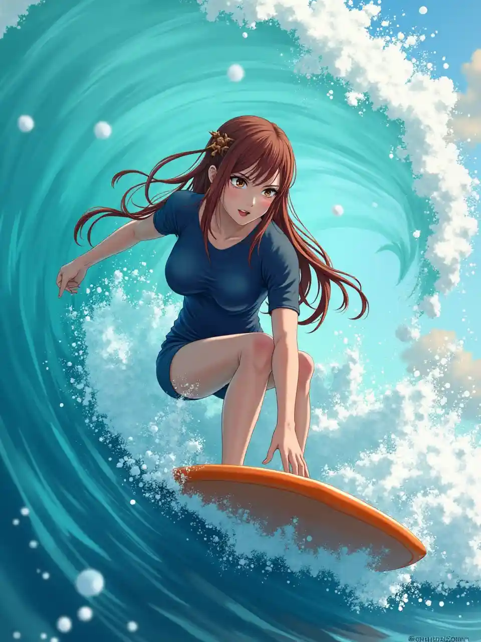 beautiful woman with long straight chestnut hair with side braid lock and striking hazel eyes, she is surfing in action, using orange surf board, navy outfit that make her body looks sexy and sporty, mesmerizing. she is inside a swirling wave, fresh blue ocean wave, dynamic angle, delicate, 2.5D, Japanese anime, anatomically correct, dynamic composition, medium close up shot, cinematic.