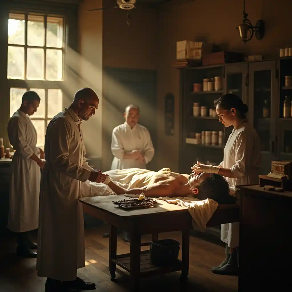 𩺠Scene Description: Dr. Daniel Hale Williams stands at the center of a modest operating room, dressed in a white linen surgical gown and gloves. His expression is one of intense focus and calm confidence as he leans over a patient on the table. Warm golden sunlight filters through tall, paned windows, illuminating motes of dust in the air and casting soft highlights on the surgical tools laid out beside him. The room is small, with dark wooden paneling, oil lamps on the walls, and basic shelves holding jars, bandages, and handwritten medical books. In the background, two nurses and one young intern (diverse ethnic backgrounds, 1890s attire) assist with quiet urgencyāone handing instruments, another checking the patient's vitals. The patient, a Black male in his 30s, lies unconscious on a sturdy wooden operating table. The camera first focuses on Dr. Williams' steady hands making careful incisions, then shifts to an overhead view showing the surgical team working in harmony. The rhythm of the scene is methodical, with slow camera pans and zoom-ins that highlight the gravity and innovation of the moment. Subtle background motion: a ceiling fan turns slowly overhead; shadows move slightly as sunlight shifts. š„ Camera Movements: Opening: Slow dolly-in from the doorway to focus on Dr. Williams' hands Mid-Scene: Overhead crane shot showing full team in action Cutaway: Close-up of surgical instruments (gauze, curved needle, 1890s clamps) on a tray Ending: Tight zoom on Dr. Williams' eyes as he sutures, brows furrowed in determination š” Lighting & Atmosphere: Lighting: Warm, natural sunlight mixed with flickering oil lamp glow Mood: Hopeful, serious, reverent Color Palette: Rich browns, soft whites, faded greens, and golden yellows Textures: Wooden floors, fabric gowns, metal tools with a slight aged patina
