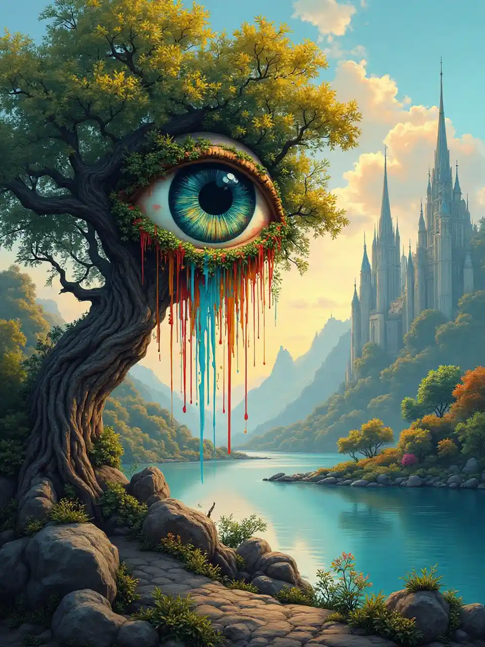 Oko zakorzenione w gałęziach starożytnego drzewa, które leży nad spokojnym jeziorem, a jego powierzchnia delikatnie sięga pod wpływem ciepłego wiatru. Oczy wypuszczają żywe kolory, tworząc kaskadę farb, które płynnie łączą się z rozległym krajobrazem. Scena przechodzi w surrealistyczne środowisko miejskie, gdzie wieże budowle odzwierciedlają sztukę Briana Despaina. Wzruszone szczegóły zdobią krajobraz miasta, przypominając głębię opowieści Marsa Ravelo i eteryczny piękno Mati Klarwein. Gra światła i cienia tańczy po scenie, uchwycając ponadczasowe połączenie natury i życia miejskiego.