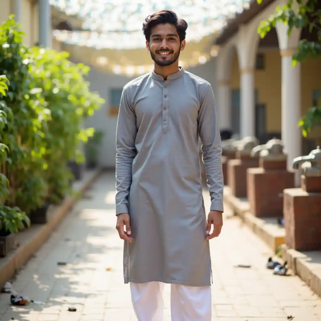 Młody człowiek, który z pewnością stoi na zewnątrz, nosi długą, szarą kurtę wraz z białymi spodniami, pokazując tradycyjne ubrania. Jego ciemne, faliste włosy ukręcają przyjazną twarz, oświetloną jasnym światłem dziennym, sugerującym południowe słońce. Na tle widnieje płytkowy teren z kranu wodnym, otoczony zielenią, w przeciwieństwie do rozrzucanego śmieci, które sugerują niezwykłe warunki. Atmosfera ta nadaje poczucie spokojnego świętowania lub wspólnego spotkania, a nad głową nieznacznie widać uroczystościowe ozdoby. Kompozycja uchwyci zarówno osobę, jak i jej otoczenie, łącząc ekspresję kulturowy z codziennym życiem.