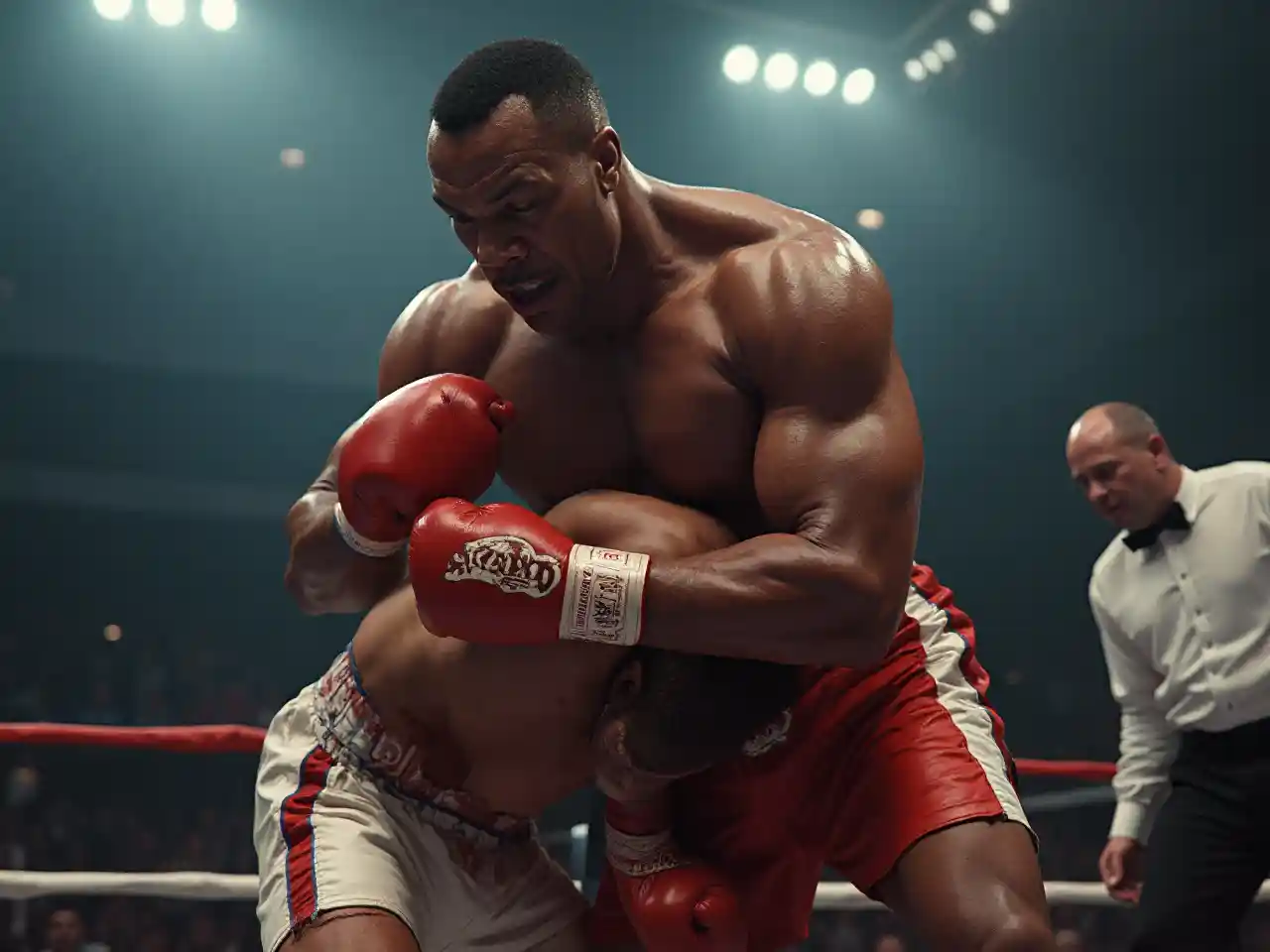 Filmowy, ultra-realistyczny obraz Mike'a Tysona w jego najlepszych latach, unoszący się nad oszołomionym i zniszczonym Peterem McNeeleyem. Mięśnie Tysona są rozdarte, błyszczące pod jasnymi światłami areny, jego pięści o o o o o o o o o o o o o o o o o o o o o o o o o o o o o o o o o o o o o o o o o o o o o o o o o o o o o o o o o McNeeley potyka się z powrotem, ma obrzęk twarzy, ranę nad okiem, krop krwi. Sędzia wpada, a wrzaskający tłum w tle jest niewyraźny. Cała scena wytryskuje siłą, dominacją i intensywnością, uchwycając surową energię brutalnego nokautu. "Hyper-detailowe, filmowe oświetlenie i ultra-HD tekstury dla maksymalnego realizmu".
