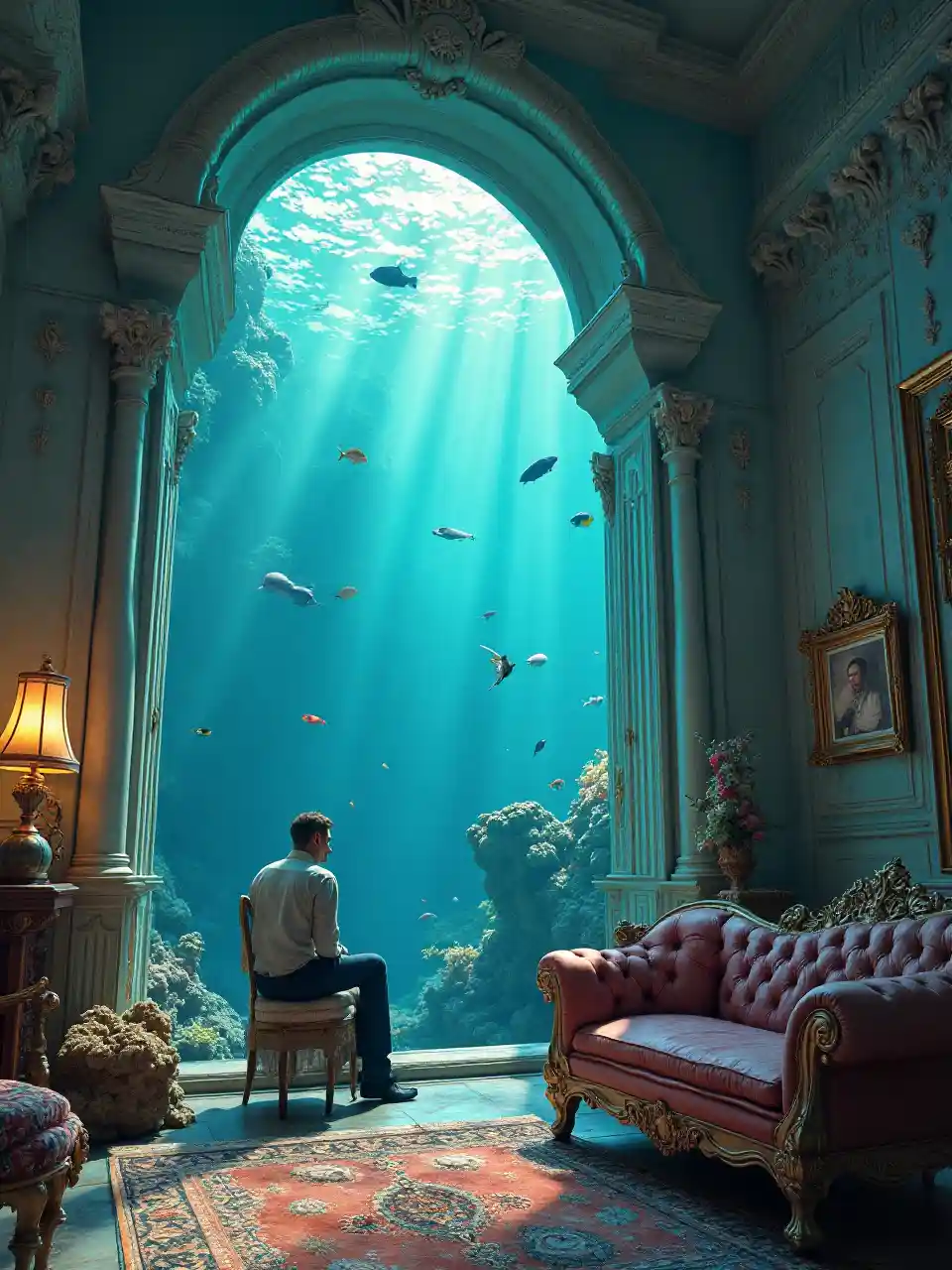 pokój dzienny w stylu rokoko pod wodą, bogate meble i ozdobne szczegóły, wysokie sufy ozdobione muszelkami, człowiek z kontemplacyjnym wyrazem, siedzący na wystawnej kanapie, patrząc przez duże eleganckie okno, życie morskie pływające w grze, miękkie eteryczne oświetlenie tworzące wymarzoną atmosferę, żywe kolory koralowe i ryby podkreślają krajobraz, ultra szczegółowe i wciągu, wysokiej jakości obraz.
