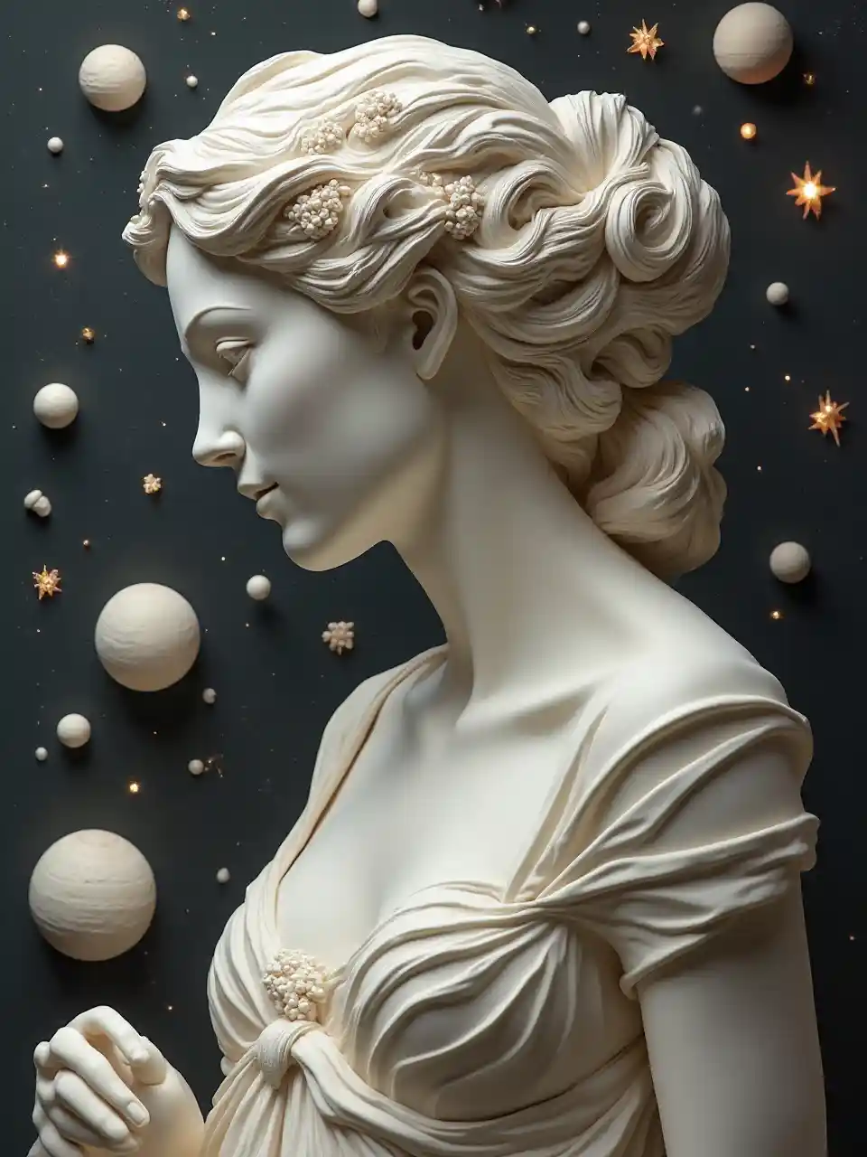 * * /Szybko: * * / "Skupa z płyty z Dziewicą, przedstawiająca gracyjną i spokojną postać kobiecej. Włosy są złożone z płynnymi szczegółami, ozdobione wzorowymi kwiatami i wiatkami pszennymi, symbolizujący związek Dziewicy z naturą. Otoczyć rzeźbę elementami niebiańskimi, takimi jak świecące gwiazdy, planety i kosmiczne formy, elegancko ułożone w tle. Użyj monochromatycznej palety o miękkim oświetleniu, aby podkreślić teksturę i ponadczasową elegancję rzeźby gipsowej, która bezproblemowo łączy się z kosmiczną tematem".