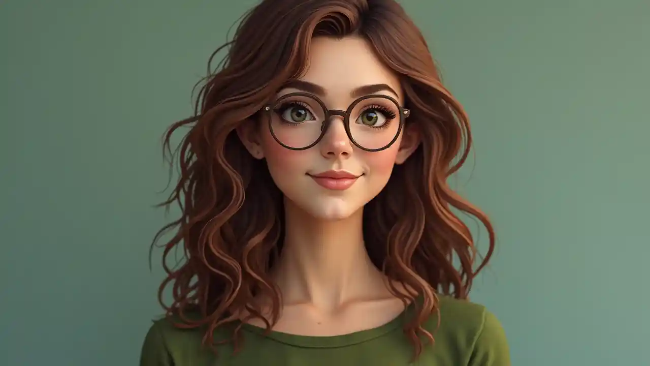 Dziewczyna z falistymi brązowymi włosami z lekko opalonymi okularami i z zielonym górnym → Dłuższe włosy