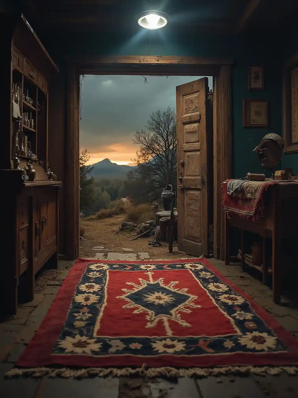Stary, zachodni, rdzenny dywan, mroczna scena, mroczna atmosfera, epicki ujęcie, ostre w szczegółach