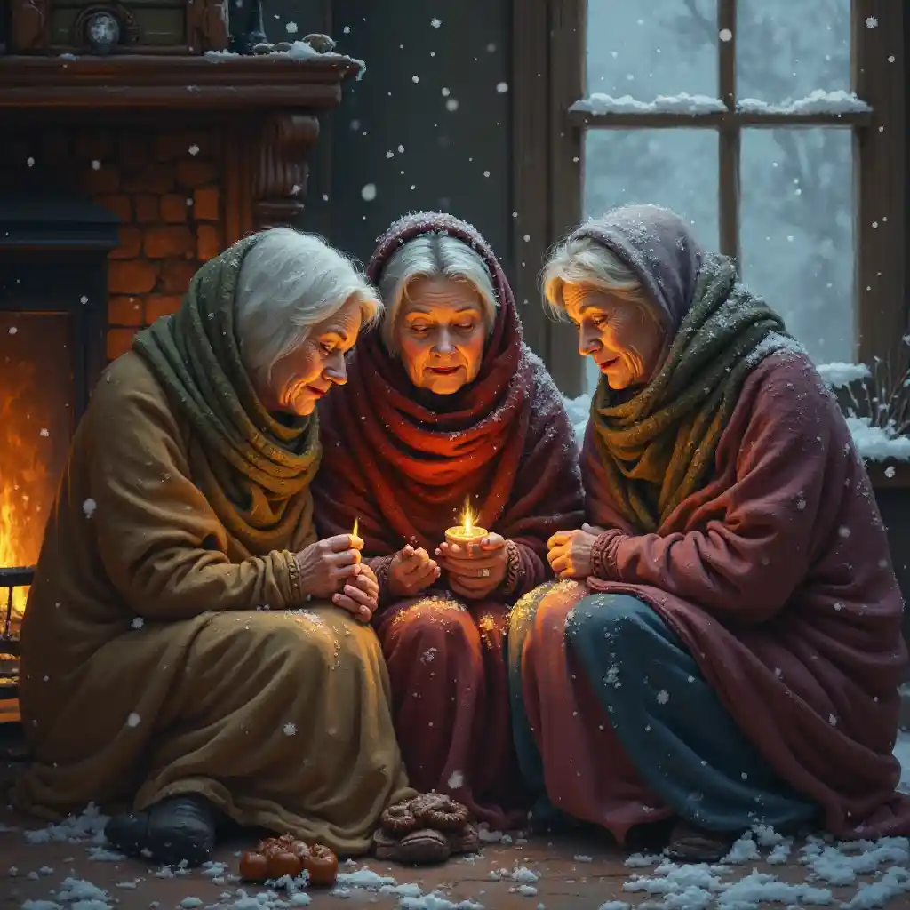 Trzy starsze kobiety, owinięte w koce, grzebiają się przy kominku, gdy na zewnątrz padać śnieg. Cyfrowe malowanie.