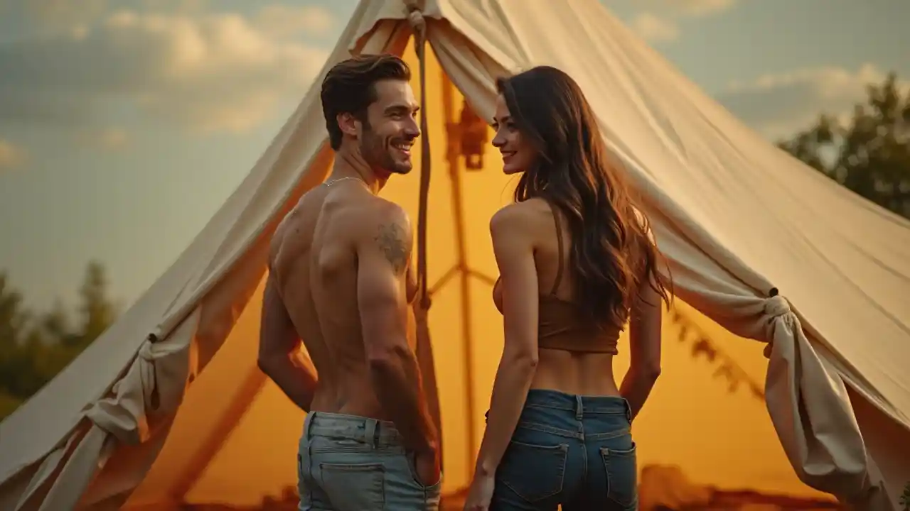 Młody człowiek z bardzo przystojnym obliczem, z krótkimi ciemnymi włosami i jasnymi (białymi zębami, błyszczącymi żywiołem), ubrany w swobodne, ale stylowe (błyszczące) ubrania, które podkreślają jego (atletycznej) sylwetki, jest ustawiony w namiocie z skompanowanymi szczegółami. Jego (przystojna twarz) i zachęcające wyrażenie twarzy sprawiają, że wydaje się gościć i otwarty. Patrzy bezpośrednio na widz, z ciepłym uśmiechem, który wysyła poczucie (magii i fantazji) do sceny. Jego (sportowa sylwetka) jest na widoku, gdy bez wysiłku obsługuje (namiot), pokazując swoje silne i zdolne ciało w (pełny strzał), widok z tyłu, ujawniający (wysoka jakość, rozdzielczość 4K) i szczegółowe szczegóły, które oddają (hyper realistyczna esencja). Nie jest sam; jego (kobieta), z (długimi, płynnymi ciemno brązowymi włosami) i (uśmiech) stoi z ufnością obok niego, ubrana w (dżins i tunika) które doskonale uzupełniają otoczenie. Scena jest (bardzo żywa i kolorowa), z (złote i miękkie oświetlenie), które emituje (ciepły i czarujący blaskiem).