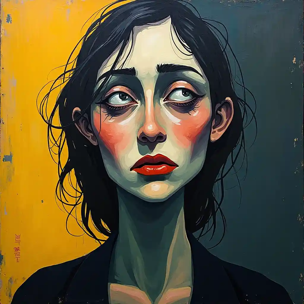 Crie um retrato cúbico e abstrato de uma pessoa inspirada em Edvard Munch, capturando a intensidade emocional e a profundidade psicológica do seu estilo icónico. Use linhas ousadas e giratórias e formas dramáticas e distorcidas para transmitir uma sensação de agitação interior ou ansiedade existencial. O retrato deve apresentar formas geométricas fragmentadas que criem uma expressão intensa e desarticulada. Use tons profundos e de mau humor, como amarelos escuros, azuis e roxos, em contraste com os fundos duros e perturbadores. Concentre-se em evocar emoção crua através da abstração, misturando a profundidade emocional de Munch com uma abordagem cubista. retratos figurativos, e foco na abstração e distorção geométrica.