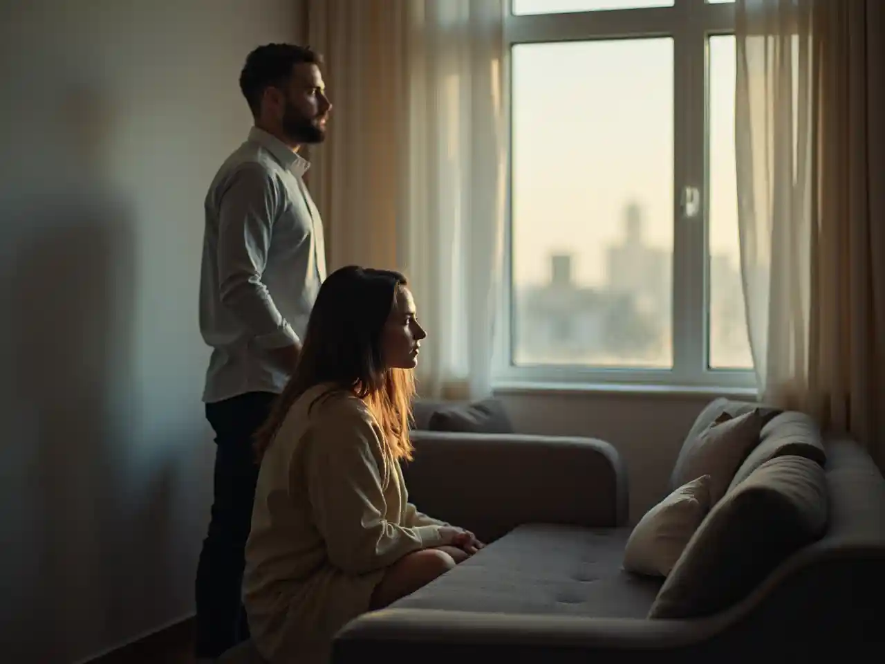 Samueluma mulher sentada num sofá num quarto com uma janela e um homem de pé atrás dela no fundo, Alena Aenami, pós-minimalismo, uma foto de stock