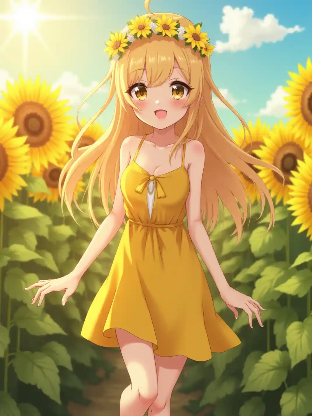 Imagem em grande escala de uma garota de anime Ultra HD, encantadoramente linda e alegre, tomando banho na hora do ouro, de pé em um campo de girassóis ao ar livre sob um céu brilhante, usando um vestido de verão com um descolamento e uma coroa de flores, seu cabelo longo pegando a luz e um sorriso radiante, grandes olhos cintilantes, pele brilhante, paleta de cores amarelas e verdes, traços suaves, maquiagem perfeita, vibrações alegres e vibrantes, brilho sua e iluminação natural, acentuando seu charmoso, peito bem definido com uma decoração sutil, e pernas, tonificadas com uma pose relax, exalando beleza e alegria.