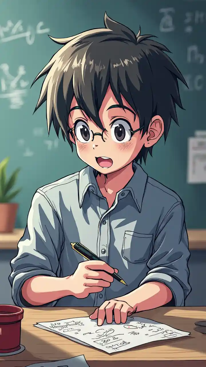 desenho em estilo anime de um garoto nerd fazendo matemática