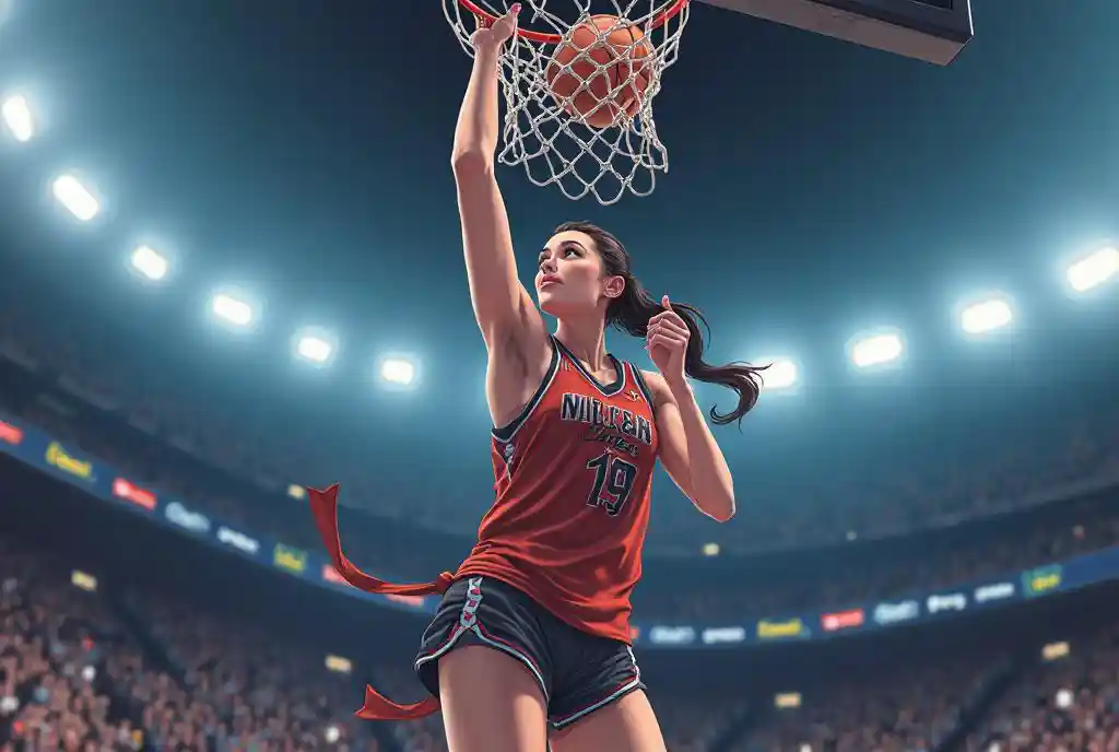 AvaMomento importante de uma partida de basquete da NBA, uma bela jogadora, pendurada de um cesto de basquete, basquete em cesto de basquete, roupas de mulher
