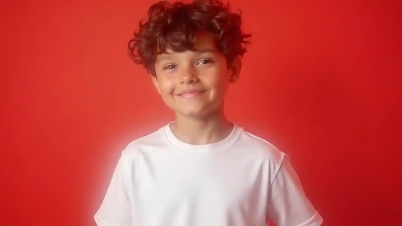 Giselleum menino vestindo camisetas brancas, de pé em frente a um fundo vermelho, camisa em branco sem impressões, de 9 anos, sorrindo, foto para maquete de roupas