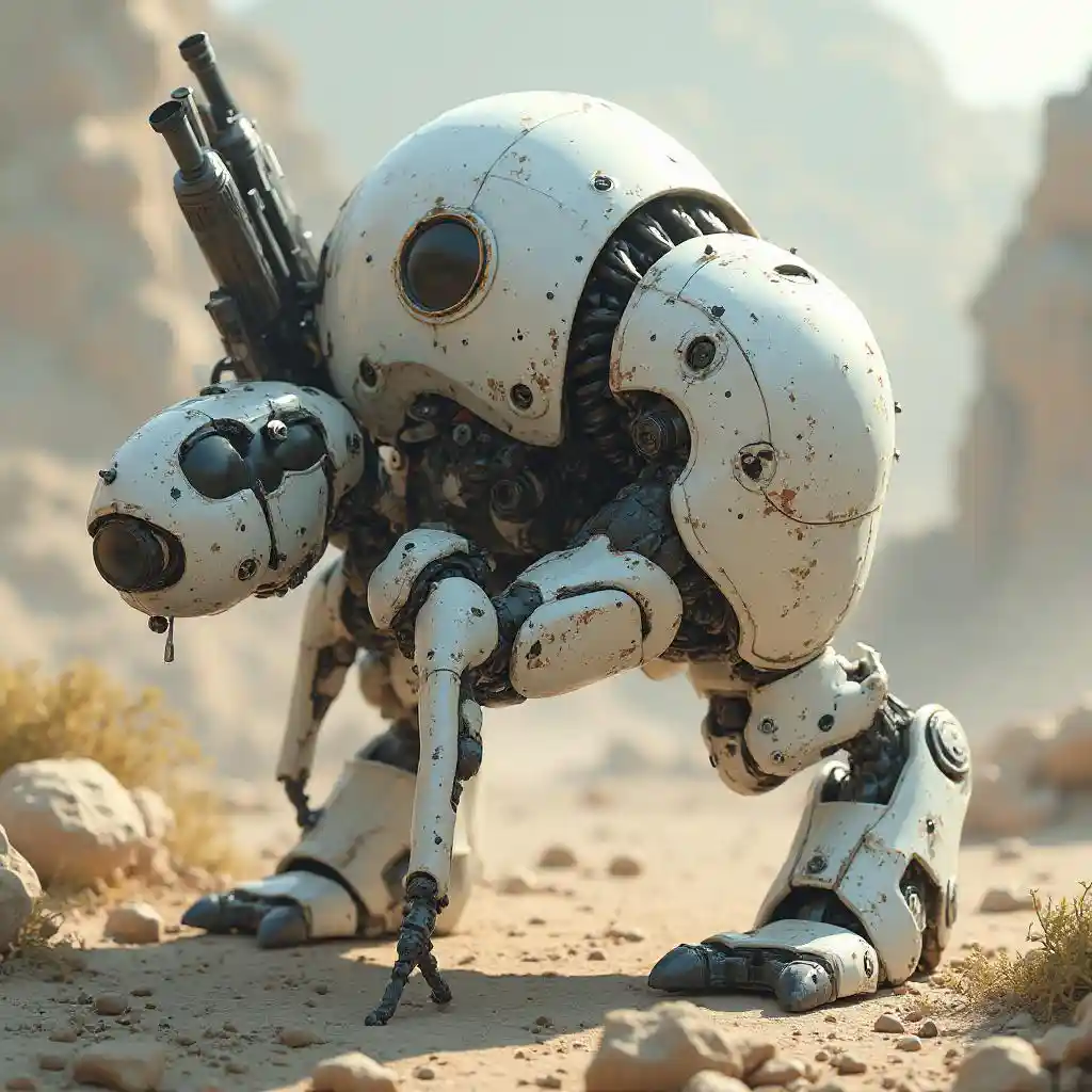 MiaFormiga branca com uma arma nas costas, ciborgue, de tamanho gigante