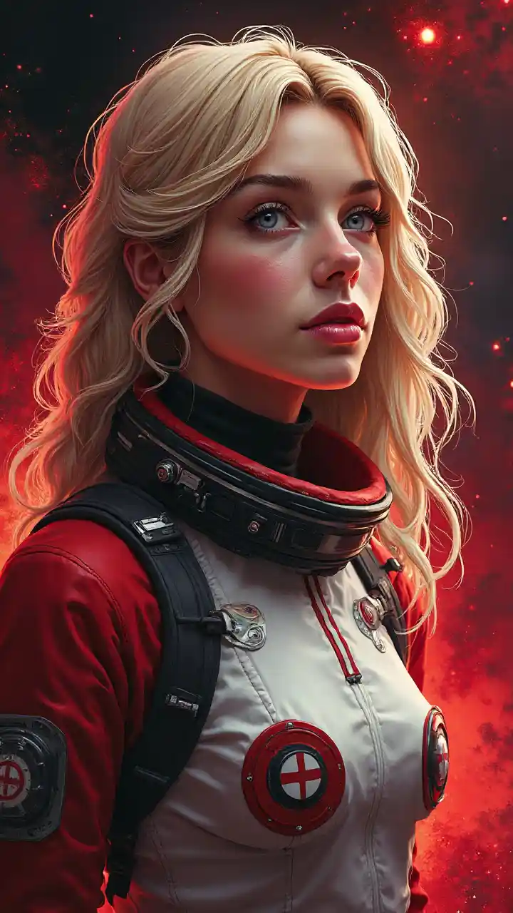 Retrato detalhado de uma esperançosa e bonita astronauta com um cabelo loiro ondulado, por Jamini Roy, resolução 4K, inspirado em automáticos, inspirado em corpos, vibrante mas sombrio mas edificante, esquema de cores preto e branco! fundo da nebulosa espacial