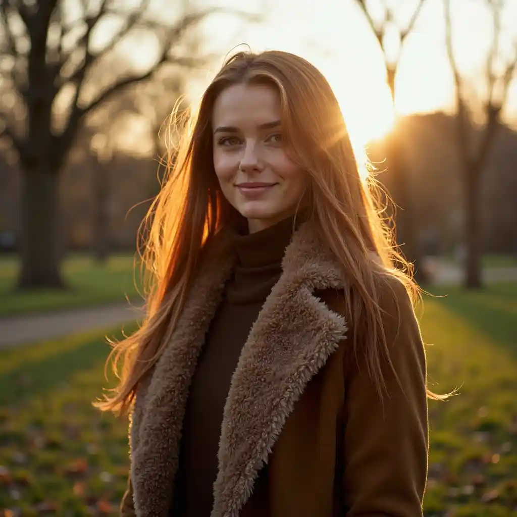 Mulher austríaca, de 25 anos, de cabelos castanhos avermelhados, extremamente longos e retos, que descem pelas costas. Ela usa um casaco de penny com bordado de pele de ovelha, colar grande, ela está em um parque em York, no amanhecer, iluminada pelo sol nas, sorrindo. filme analógico.