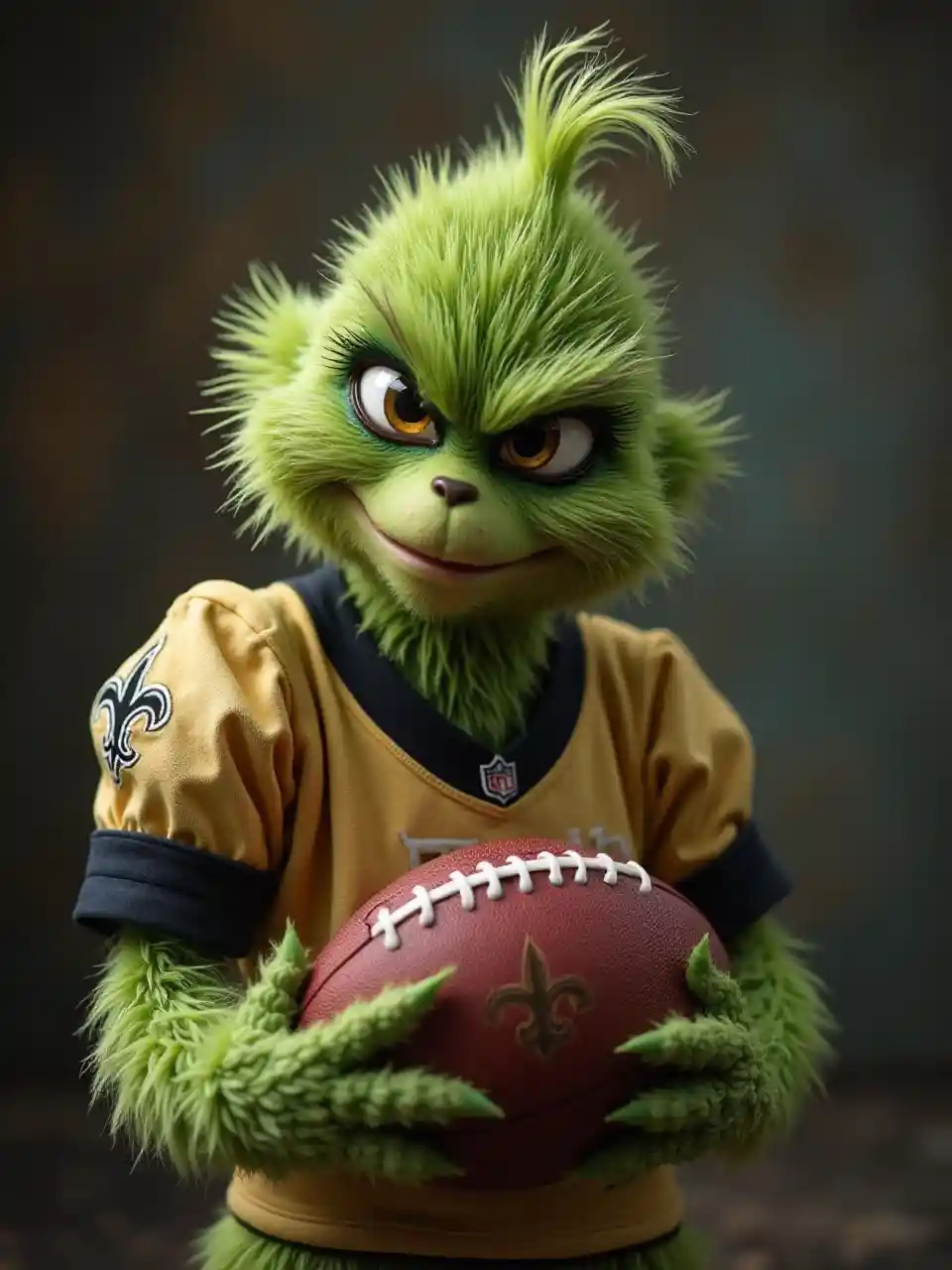 O Grinch a usar a camisola da equipa dos Santos a segurar uma bola