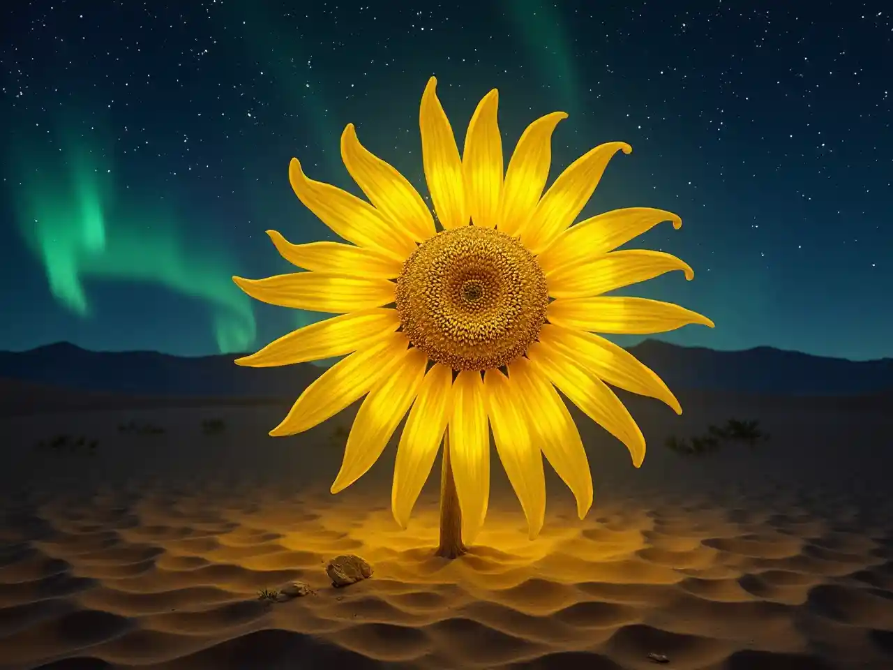 Uma criatura gigante de bioluminescência de tons amarelos com detalhes intrincados e pétalas largas, que emana um brilho suave que se reflete em sua superfície, em um pano de fundo do deserto à noite, onde as estrelas cintilantes do céu aurora lançam um brilho etéreo através do terreno árido