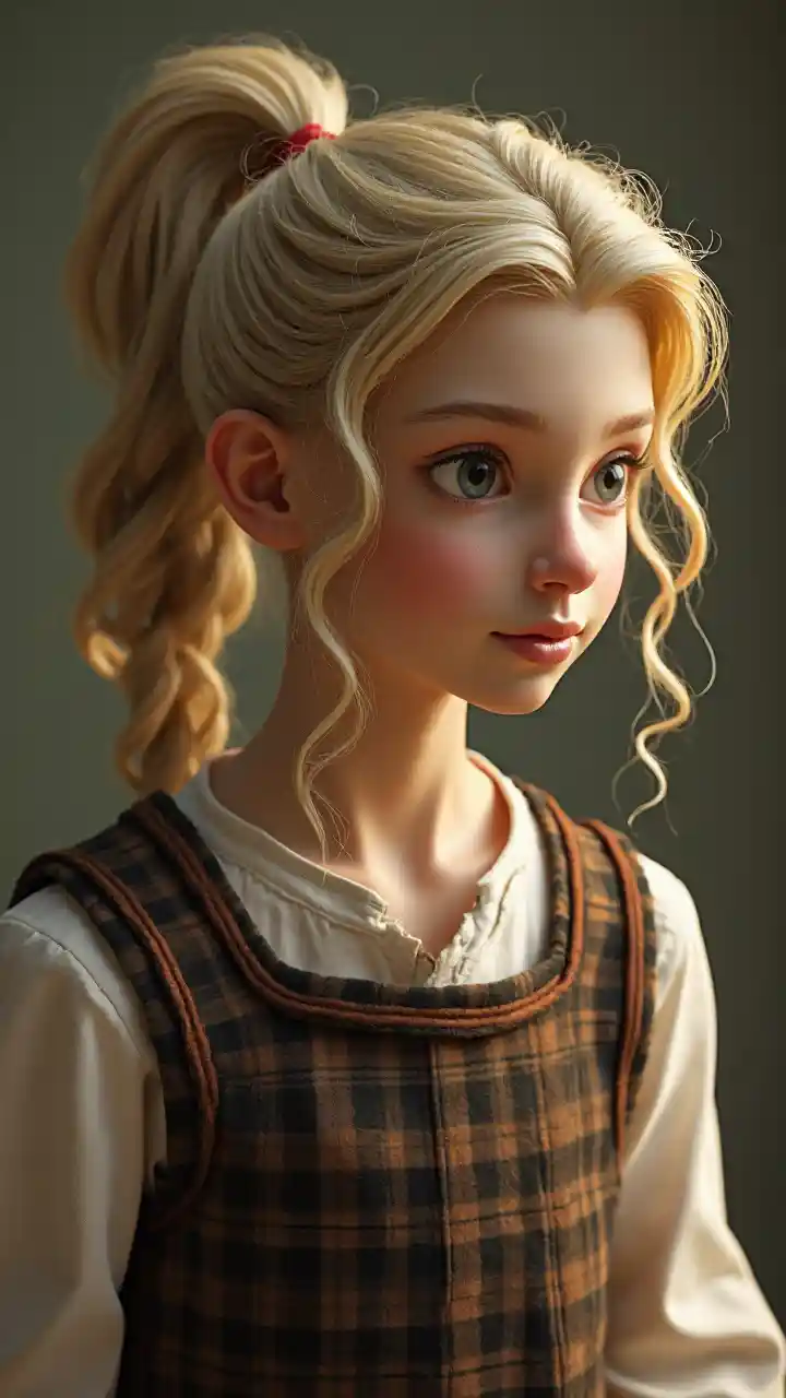 Modelo loira realista com cabelo ondulado, com cauda alta e arbustida, com roupas ortodoxas, 8k