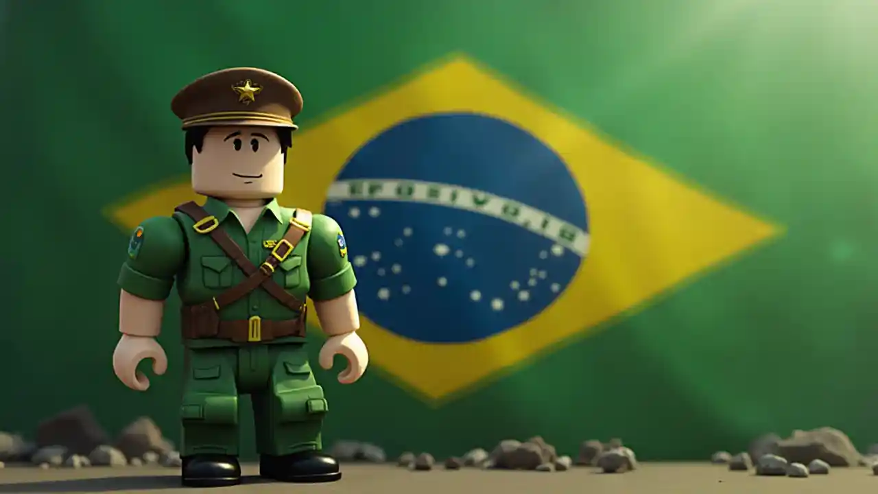 MaverickFaça um jogador roblox com um uniforme do exército brasileiro em pé na frente da bandeira do Brasil e com um título com as cores brasileiras escritas " Exército Brasileiro "