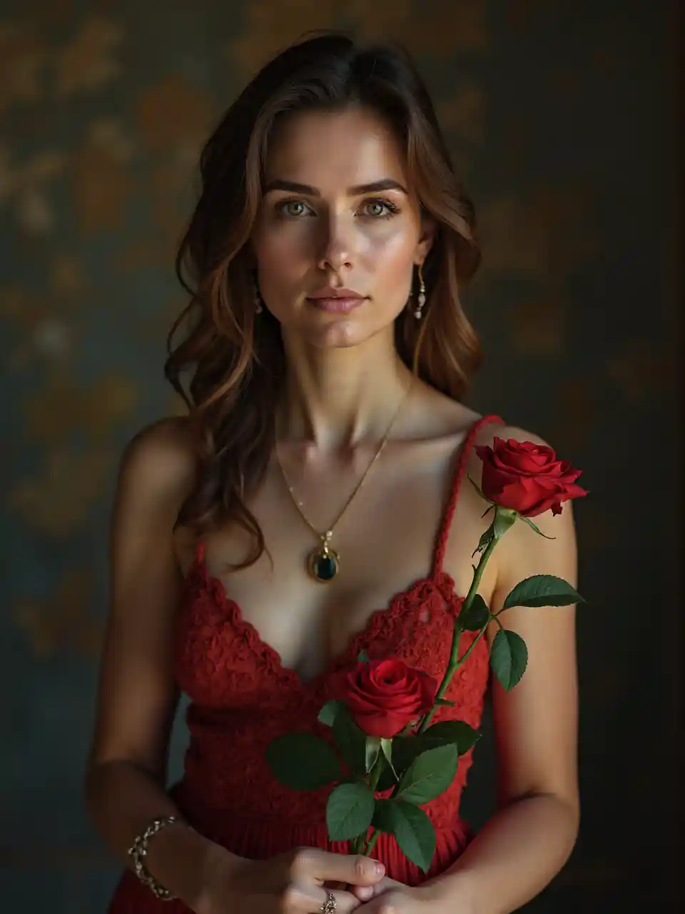 Uma mulher caucasiana deslumbrante segurando uma rosa
