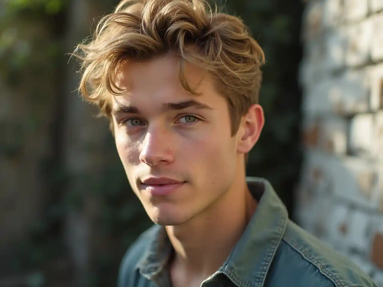 Jovem Aproximadamente 24 anos Cabelo loiro sujo Olhos verdes O olhar do rapaz da porta ao lado Bonito Magro mas não musculoso Sorrindo Encantador