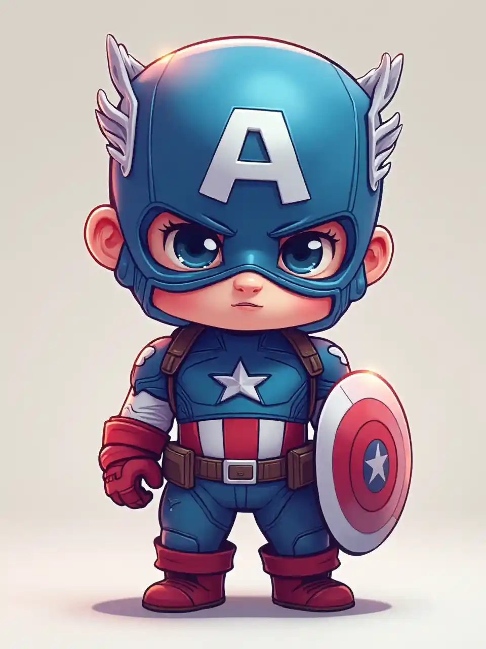 O Capitão América hiperrealista no estilo Chibi. Bela, visão isométrica, 4K, colorida, cinemática, ampliada, foto de corpo inteiro, cabeça grande, fundo de néon neutro.