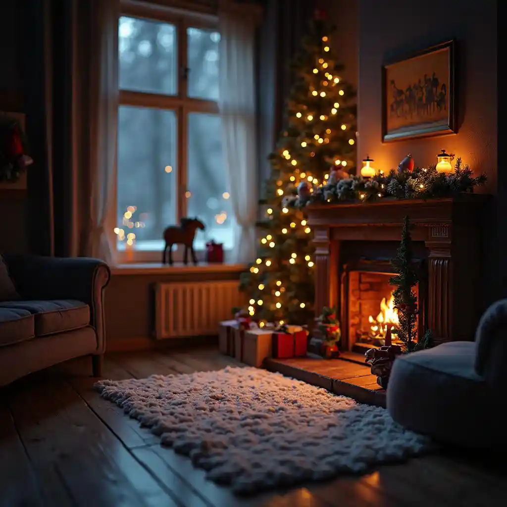 A imagem de uma noite de Natal dentro de um quarto quente com pequenas luzes no chão, a réplica de 2025 está ao lado de um acessório de Natal e neve artificial caiu.