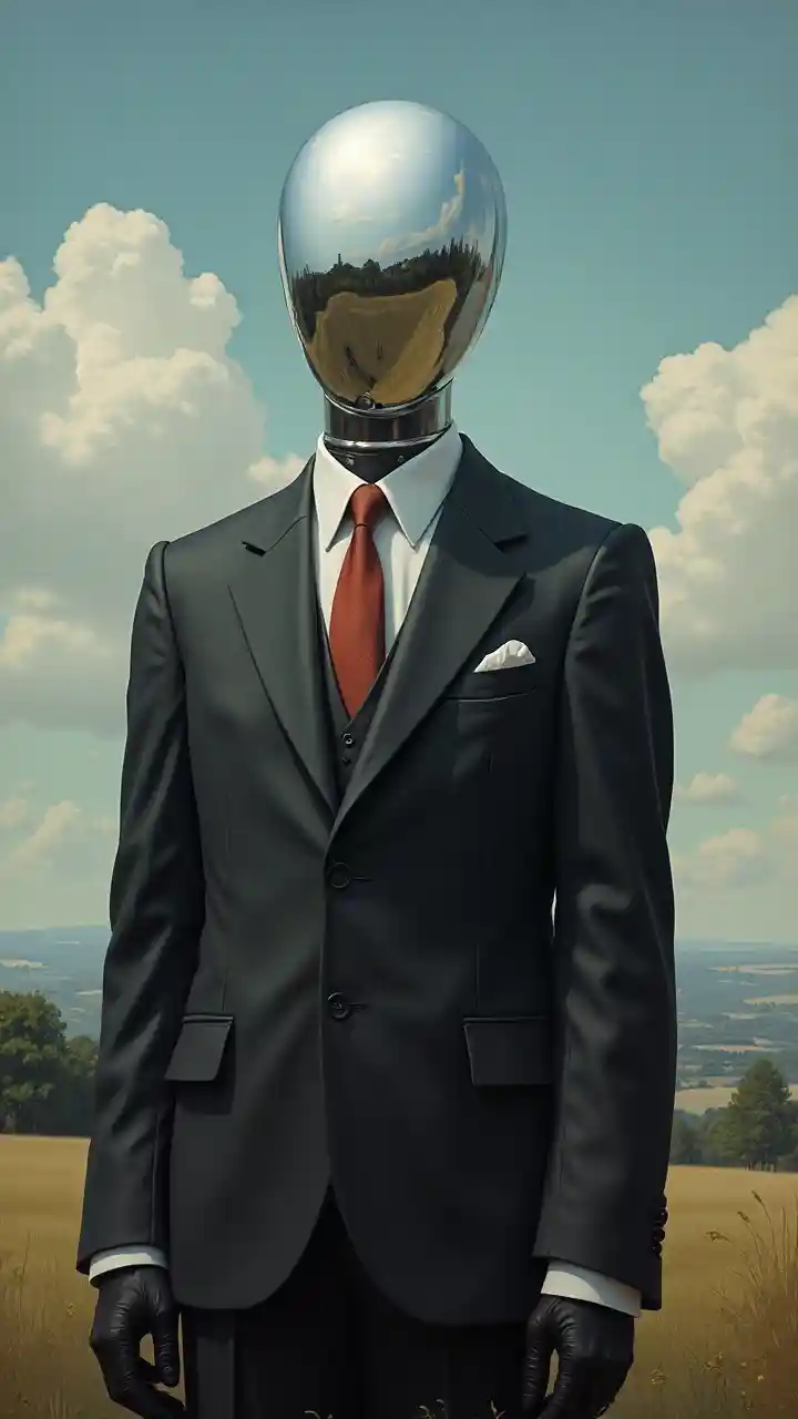 Retrato de um homem sem rosto com cabeça cromada, com fato e luvas pretas, nuvens e paisagem natural no fundo, por Rene Magritte, pintura detalhada, distância, centrado, hd, alta resolução, alta detalhe,