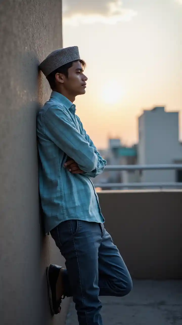 Um jovem, parado de forma casual contra uma parede, exala um ar de contemplação na suave luz do crepúsculo. Ele usa uma camisa de quadros azul claro e um boné tradicional, os braços cruzados, enquanto olha pensativo para a distância. A varanda que ele ocupa dá para ver uma paisagem da cidade que sugere um fundo de sol, lançando um brilho dourado na cena. A superfície de concreto sob ele contrasta com o céu sereno acima, criando uma composição simples, mas impressionante, que capta um momento de reflexão. O ambiente é calmo, evocando uma mistura de introspecção e paz à medida que o dia passa para a noite.