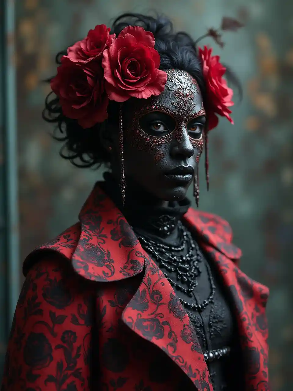 cor da revolução anjo no preto os olhos padrão casaco em fantasias de cosplay, estilo flor , slipknot máscara roco, retrato de mídia social, enfeites intrincados, branco escuro e carmesim mate, RT, photobash, terrorwave