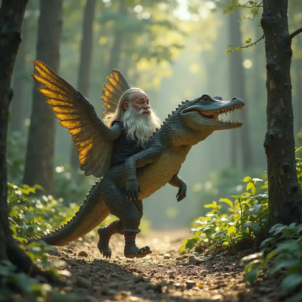 JocelynAnão magro correndo com um crocodilo voador numa floresta