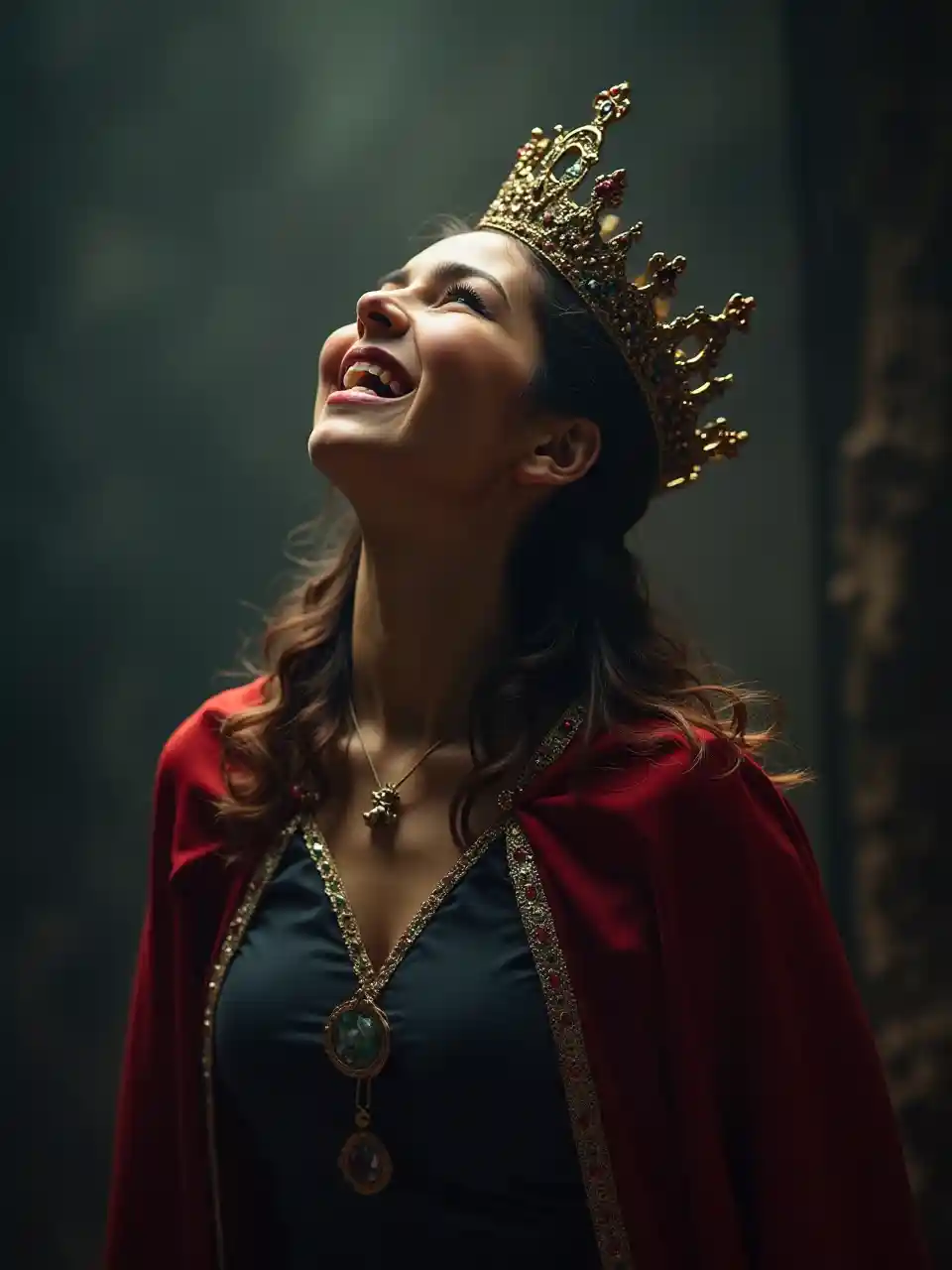 Uma mulher sorridente com coroa e capa, olha para cima, iluminação dramática,