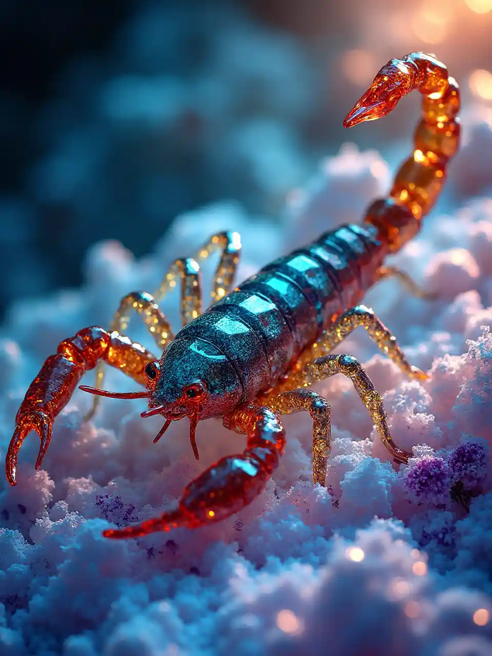 Um escorpião de cristal no estilo Swarovski, cores vibrantes, alto detalhe, luz de contraste, foco nítido