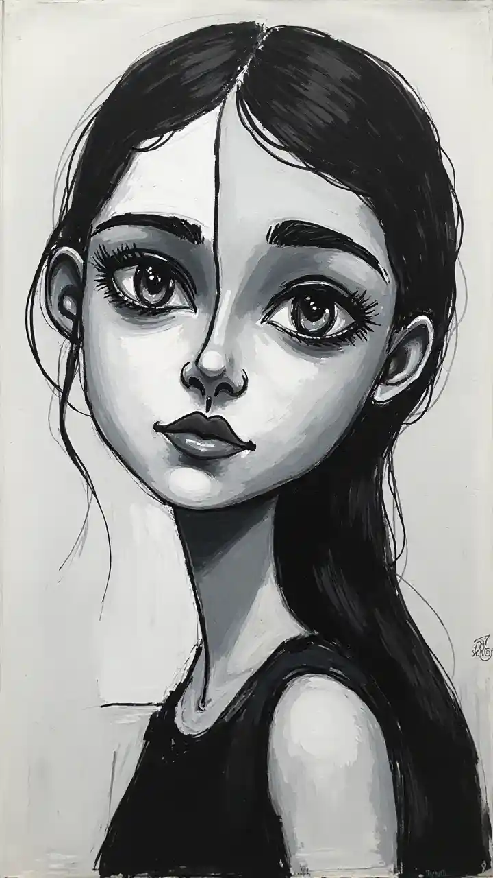 pintura cubista monocromática de uma menina de 7 anos, inspirada nas obras-primas cubistas de Pablo Picasso, rosto fragmentado com planos geométricos sobrepostos, ângulos nítidos e proporções distorcidas, tons de preto, branco e cinza, expressividade e simplicidade emocional, linhas ousadas definindo contornos, fundo de tela texturizado, forte impacto visual, estilo artístico bruto e minimalista, reminiscências das obras de Picasso, alta resolução, obra de arte de qualidade galeria