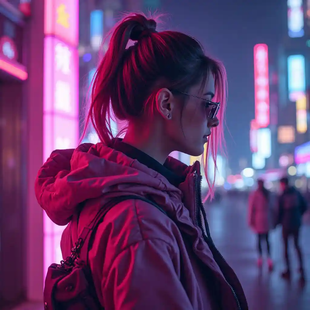 feminina, moda de rua, cyberpunk, cidade do futuro, luz rosa e roxa, futuro próximo