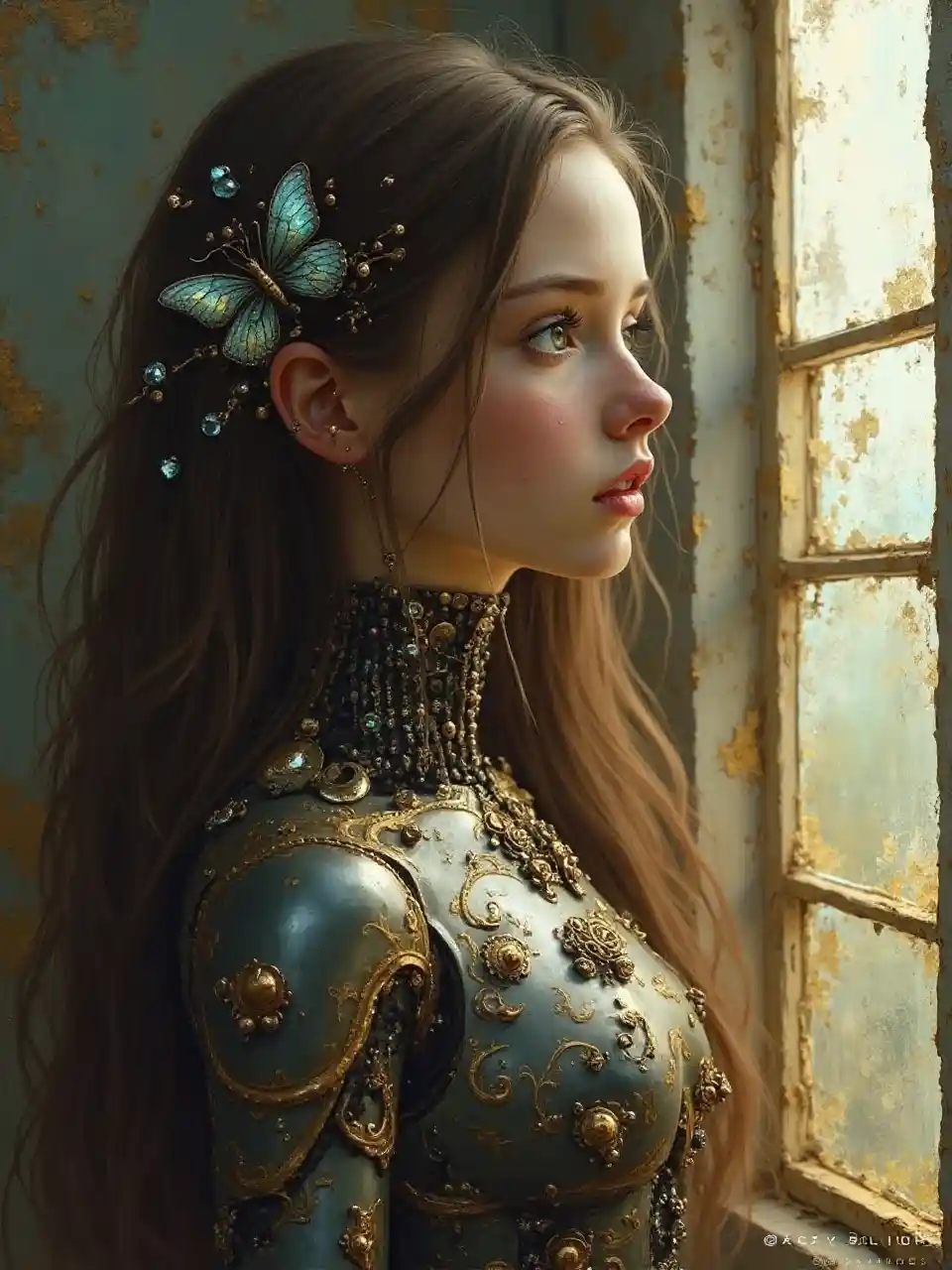 No estilo evocador de Casey Baugh, arte de uma bela jovem ciborgue com cabelos castanhos longos, futurista, scifi, intrincado, elegante, altamente detalhado, majestoso, pincel de Baugh infunde a pintura com uma combinação única de realismo e abstração, Greg Rutkowski, filigrana de ouro surreal, vidro quebra, (obra-prima, iluminação lateral, detalhados olhos bonitos: 1.2), hdr, pintura realista, pele natural, pele texturada, boca fechada, olhos de cristal, filigrana de borboleta, armadura de peito, maquiagem de olhos, articulações robóticas, cabelo longo movido pelo vento, janela de frente para outro mundo, o estilo distintivo de Baugh captura a essência da natureza enigmática da menina, convidando os espectadores a explorar as profundezas da sua alma, a ganhar prémios