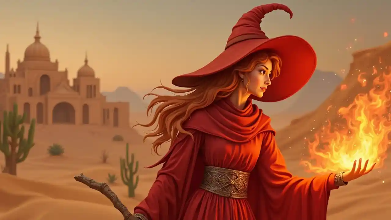 Rainha de Fogo do Deserto adulta, de túnica vermelha, de chapéu de bruxa vermelho, e de cabelo laranja, fazendo piromancia numa cidade do deserto