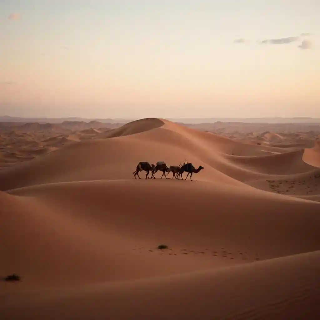 Dunas de areia rolante, com a silhueta de uma caravana de camelos solitários no crepúsculo.