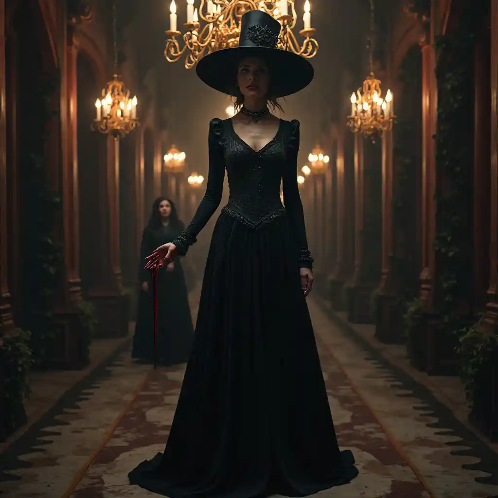 A Senhora Dimitrescu está num salão de mármore escuro iluminado por lustres dourados, com vinho vermelho a goar da mão. Seu chapéu de bordas largas lança uma sombra sobre seu sorriso arrepiante. A arquitetura gótica por trás dela está coberta de veludo e hera. O chão reflete a silhueta das filhas que se escondem atrás dela. Estilo de horror gótico, ameaça real, detalhes em 4K.